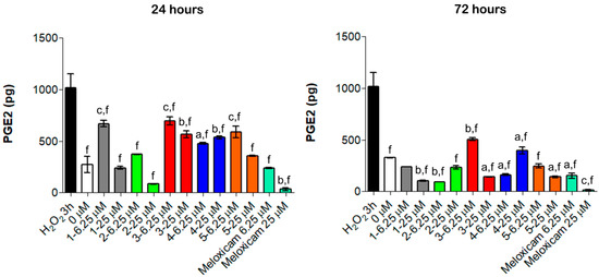 Consistent with literature data [27], even a short exposure to H2O2 for 3 h increased PGE2 secretion up to 1014.2 pg (Figure 6). Notably, all the tested compounds lowered the amount of PGE2 compared to the H2O2 pre-incubation but were less effective than Meloxicam (Figure 6). Compared to our previous experiments, the obtained data revealed a different trend of activity: compounds 1, 2 and 5 showed remarkable anti-inflammatory effects and considerably reduced PGE2 secretion already at 24 h and mainly at 25 µM (240.5 pg, 84.8 pg and 357.1 pg, respectively), whereas compounds 3 and 4 were less efficient. Moreover, the modulation of PGE2 is time-dependent, being that this cytokine decreased over the time. Actually, the amount of PGE2 was almost halved with all the tested compounds after 72 h of exposure compared to 24 h treatment (Figure 6). These findings support the hypothesis that the observed anti-inflammatory effects rely on a COX-2 mediated mechanism of action and that the organometallic complexes retain the ability to inhibit COX-2.