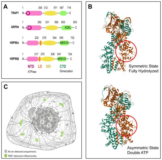 TRAP1 molecular structure. (A) Prototypic HSP90 family member has three structural domains, an N-terminal domain (NTD) responsible for ATP binding, a middle domain (MD) which is important for client binding, and a C-terminal domain (CTD) responsible for dimerization. GRP94 contains also a KDEL motif. While HSP90α and HSP90β contain a MEEVD motif and a linker domain (LD). Mitochondrial signal sequence present in TRAP1 is indicated with “M” and endoplasmic reticulum signal sequence present in GRP94 is indicated with “ER”. Lengths of HSP90α, HSP90β, GRP94, and TRAP1 are 732, 724, 803, and 704 amino acids, respectively. (B) 3D structures of TRAP1 dimer in different nucleotide states, with each protomer in a different color. Symmetric state of TRAP1 in fully hydrolyzed state of protein (PDB code 5TVX; image available at https://www.rcsb.org/3d-view/5TVX/1; accessed on 29 September 2021) [11,12,13,14]. Asymmetric state of TRAP1 in double ATP state (PDB code 6XG6; image available at https://www.rcsb.org/3d-view/6XG6/1; accessed on 29 September 2021) [11,13,14,15]. Red circle highlights substructure in middle domain that undergoes rearrangement upon nucleotide hydrolysis; reproduced with permission from RCSB PDB. (C) TRAP1 is primarily located in mitochondria. TRAP1 detection in cell mitochondria is highlighted in green (image available at v20.proteinatlas.org/ENSG00000126602-TRAP1/cell; accessed on 29 September 2021); reproduced with permission from The Human Protein Atlas.