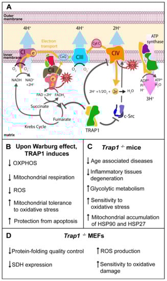Role of TRAP1 in energetic metabolism regulation. (A) TRAP1 modulates oxidative phosphorylation (OXPHOS) by interacting with proteins of mitochondrial electron transport chain (ETC), namely succinate dehydrogenase (SDH) and cytochrome oxidase, also known as complex II and complex IV, respectively. TRAP1 inhibits proto-oncogene tyrosine-protein kinase (c-Src) downregulating cytochrome oxidase activity. TRAP1 also inhibits SDH activity, resulting in less electron funneling and lower reactive oxygen species (ROS) generation as a side-reaction of ETC. (B) Upon conditions of shortage of oxygen, also known as Warburg effect, TRAP1 induces downregulation of OXPHOS, decreasing ROS production and mitochondrial respiration. Moreover, OXPHOS downregulation is associated with increased mitochondrial tolerance to oxidative stress, and protection from apoptosis; (C) Trap1 knockout mouse showed a reduced incidence of age-associated pathologies and inflammatory tissue degeneration. It also presented a switch to glycolytic metabolism, increased susceptibility to oxidative stress and increased mitochondrial accumulation of cytoprotective chaperones Hsp90 and Hsp27. (D) Trap1 knockout mouse embryonic fibroblasts (MEFs) exhibited loss of protein-folding quality control in mitochondria and decreased SDH expression. While showing increased ROS production and increased sensitivity to oxidative stress.