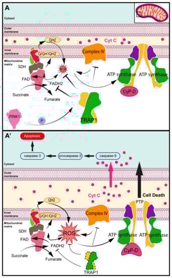 Role of TRAP1 in redox homeostasis. (A) TRAP1 inhibits reactive oxygen species (ROS) accumulation by controlling respiratory complexes of electron transport chain (ETC), namely, succinate dehydrogenase (SDH) and cytochrome oxidase. Through its interaction with cyclophilin D (CypD), TRAP1 inhibits mitochondrial permeability transition pore (mPTP) formation. Overexpression of TRAP1 blocks mitochondria-mediated apoptotic cascade and ensuing caspase-3 activation. (A’) PTEN-induced kinase 1 (PINK1) depletion leads to cytochrome C (CytC) release, which correlates with reduction in TRAP1 phosphorylation by PINK1. Activated CypD sensitizes mPTP to opening, leading to mitochondrial swelling and depolarization, with outer membrane ruptures causing release of CytC into cytosol and eventually cell death.