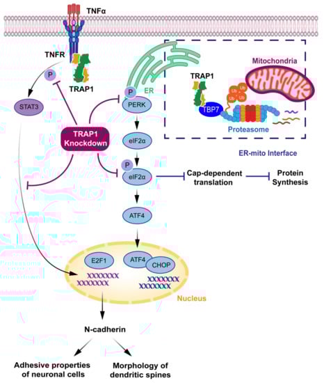 Song et al. reported that TRAP1 binds to the intracellular domain of TNFR1 [17]. However, TRAP1 is probably a misnomer, as its association with TNFR1 was observed with a two-yeast hybrid assay, which is prone to false-positive results, and it was not confirmed by subsequent studies. Controversies apart, TRAP1 is suggested to interact with the TNF-α/TNFR1 pathway [75,76]. In this pathway, following its interaction with TRAP1, TNFR1 phosphorylates signal transducer and activator of transcription 3 (STAT3) that initiates transcription of the E2F1 transcription factor [68]. Kubota et al. demonstrated, in a neuronal cell line, that, under TRAP1 knockdown conditions, there is a decrease in phosphorylation of STAT3, which results in the reduction of E2F1 and a downregulation of N-cadherin. This affects the adhesive properties of the cells and influences the morphology of dendritic spines.