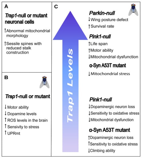 Role of TRAP1 in neurodegeneration. (A) SH-SY5Yneuroblastoma cells lacking TRAP1 showed abnormal mitochondrial morphology, with decreased number of fragmented mitochondria with increased connectivity. Moreover, hippocampal rat neurons with reduced levels of TRAP1 presented an increased number of sessile spines with reduced stalk construction. (B) Trap1-null or mutant flies presented decreased motor ability and dopamine levels, while showing increased reactive oxygen species (ROS) levels in their brains, increased sensitivity to stress, and increased mitochondrial unfolded protein response (UPRmt). (C) Knockdown or overexpression of TRAP1 in different genetic backgrounds has different outcomes in terms of survival of dopaminergic neurons, mitochondrial dysfunction, life span, and motor ability.