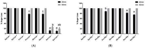 Alphacel, a non-reactive fiber, was used to simulate a matrix in simple dry sugar–amino acid mixtures that were heated at 150 °C for 20 and 40 min, respectively. In general, both the presence of Alphacel and the different types of reacting sugar and amino acids in mixtures were factors that influenced the recovery of total soluble MRPs (Appendix A, Table A1). The presence of Alphacel produced relatively small but significant losses (p < 0.05) of the reducing sugar fructose, when heated for 20 min with lysine (Figure 1A) or glycine (Figure 1B). Glu-, when present with glycine, was lost at both temperatures. Xylose, on the other hand, was completely lost regardless of the presence of Alphacel and at both heating temperatures for both amino acids, lysine (A) and glycine (B). Fru-glycine and Fru-lysine respectively, when heated in the presence of Alphacel, displayed the lowest (p < 0.05) loss of reducing sugar after 20 min of heating. The non-reducing sugar, sucrose, displayed markedly lower (p < 0.05) losses compared to the reducing sugar–amino acid products. Proportional losses of sucrose were also relatively lower (p < 0.05) when reacted with lysine compared to glycine, when in the presence of Alphacel.