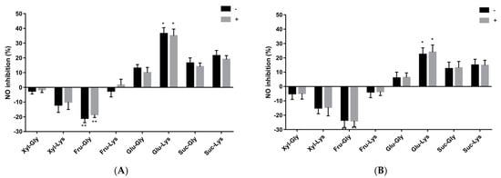 Promotion/inhibition of NO in differentiated Caco-2 cells incubated with sugar–lysine and sugar–glycine. MR reactants for 20 (A) and 40 (B) minutes respectively, at 150 °C. − = without Alphacel; += with Alphacel. Cells were treated with MRP samples respectively, for 24 h and then stimulated with 8000 U/mL IFN-γ + 0.1 μg/mL PMA for 48 h. Values represent mean ± SD (n = 6). * Significant NO inhibition, ** significant NO promotion among different samples (p < 0.05).