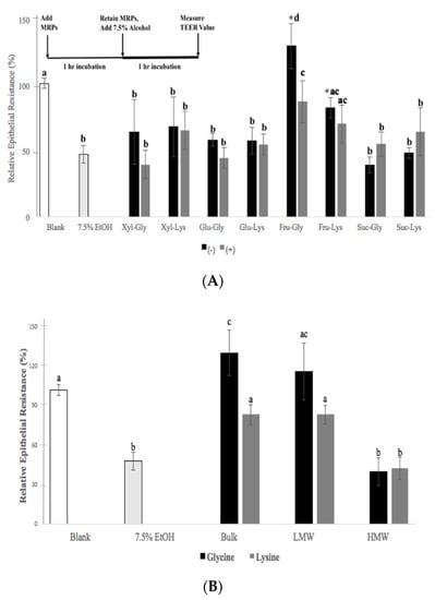 Recovery of high and low molecular weight MRPs was accomplished by multistep ultrafiltration under nitrogen (40 psi) and individual fractions (LMW = <1 KDa; HMW = >1 KDa) were collected and freeze-dried. Caco-2 cells were seeded in 24-well translucent, high-density polyethylene terephthalate membrane trans-well (0.40 µm pore size, 0.3125 cm2 growth surface area) inserts (BD Biosciences, San Jose, CA, USA) at a concentration of 2.5 × 105/cm2 and incubated for 21 days to establish differentiation. Monolayer integrity was checked initially using 100 µM of Lucifer yellow applied to the apical side of the insert. Lucifer yellow transported to the basolateral side was quantified with a luminometer at Ex/Em = 425 nm/350 nm (Fluoroskan Ascent, Helsinki.). Caco-2 cells were treated with MRPs for 1 h prior to exposure to 7.5% ethanol for another 1 h thereafter. Previous work established that 7.5% ethanol was effective at inducing changes in epithelial monolayer resistance without affecting viability [,]. Specifically, a Millicell® ERS voltammeter (Millipore Ltd., Etobicoke, Ontario, Canada) was used to measure the electrical resistance between apical and basolateral compartments. TEER values were recorded as Ω.cm2. The TEER value was measured both before and after the transport experiments to ensure the integrity of the monolayers. To check for repeatability, all transport experiments were performed at least three times in duplicate assays. Relative TEER values were determined according to Equation (8):