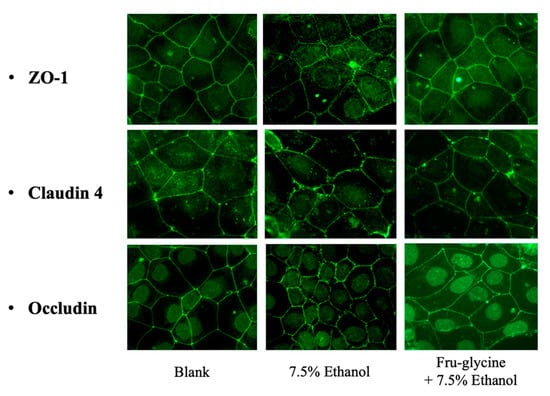 Immunofluorescence staining of Caco-2 TJ proteins, ZO-1, claudin 4, and occludin. Blank = non-treated cells. 7.5% ethanol was the positive control and treatment with Fructose–glycine MRP was prior to ethanol exposure.