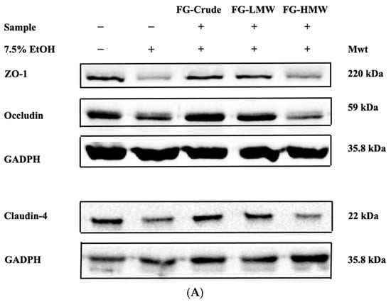 Caco-2 cells (1 × 105/cm2) were seeded on 8-well cover slips (Nunc Inc., Naperville, IL, USA) and incubated for three weeks in 0.25 mL MEM, supplemented with 10% FBS (Gibco, Carlsbad, CA, USA) and 100 units/mL of penicillin and 100 μg/mL of streptomycin (Sigma). Twenty-one-day differentiated Caco-2 cells were pre-treated with MRP samples for 60 min, and then sequentially incubated with 7.5% ethanol for another 60 min (scheme shown in Figure 3A). The medium was replaced, and cells were washed three times using ice-cold PBS, fixed in 300 μL of 2% paraformaldehyde for 20 min at room temperature, and then washed again with ice-cold PBS. The Caco-2 cells were treated with 0.1% Triton X-100 for 20 min, washed three times with ice-cold PBS, and treated to remove non-specific binding using 3% bovine serum albumin (BSA) in PBST (PBS + 0.1% Tween 20) as the blocking agent for 60 min. Cells were incubated with primary antibodies that included anti-Claudin 4, anti-occludin, anti-ZO-1, and anti-glyceraldehyde 3-phosphate dehydrogenase (GAPDH) (Abcam Inc., Cambridge, MA, USA) respectively, in blocking buffer at 4 °C in the dark for 60 min []. Caco-2 cells were visualized with fluorescein isothiocyanate (FITC)-conjugated Anti-IgG secondary antibody (Abcam Inc., Cambridge, MA, USA) for 60 min. Coverslips were mounted with 0.4% n-propyl gallate in 90% glycerol and sealed. The morphology of tight-junction proteins was observed using a Zeiss fluorescence microscope (Carl Zeiss Microscopy GmbH, Jena, Germany).