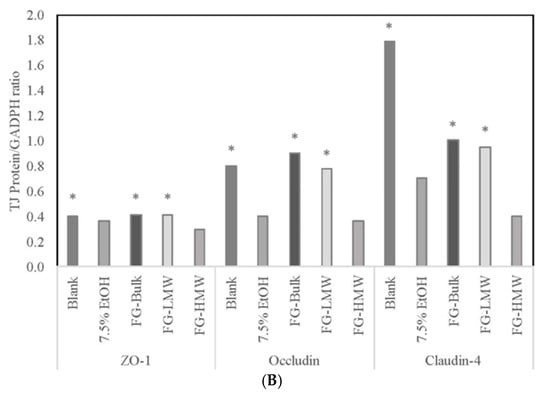 Effect of Fru-glycine (FG) fractions on Caco-2 cell TJ proteins, ZO-1, occludin, and claudin-4 protein expression in ethanol-induced Caco-2 cells. FG-Bulk (crude), FG-LMW (Fru-glycine low molecular weight), FG-HMW (Fru-glycine high molecular weight fractions). (A) TJ protein electrophoresis separation with GADPH = glyceraldehyde 3-phosphate dehydrogenase. (B) Densitometry readings of separated TJ proteins. Blank (no ethanol), 7.5% ethanol, FG-Bulk (crude), FG-LMW (low molecular weight), FG-HMW (high molecular weight). * Indicates significant (p < 0.05) difference between 7.5% ethanol and blank, and FG samples (within groups) respectively, for ZO-1, occludin, and claudin-4, respectively.
