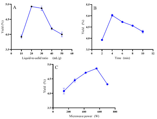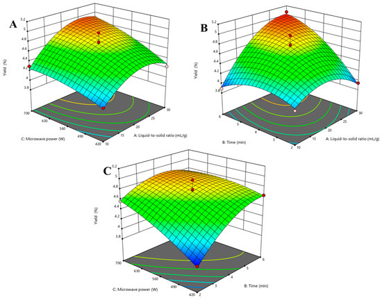 Based on the regression model, the response surface contour lines of the interactions between the liquid-to-solid ratio, time, and microwave power are shown in Figure 2. The coefficients of the quadratic terms (X12, X22, X32) in the equation were all negative values, and the equation parabolic opening downward had a maximum value [29], which was the highest point at the response surface. The interaction between the liquid-to-solid ratio and the microwave power at an extraction time of 4 min is shown in Figure 2A. The microwave power was constant, the yield displayed a trend of first increasing and then decreasing. The yield increased with increasing microwave power at the fixed extraction time. The interaction between the liquid-to-solid ratio and microwave power was not significant (p > 0.05). The interaction between the liquid-to-solid ratio and time with a fixed microwave power of 560 W is shown in Figure 2B. With increasing liquid-to-solid ratio and time, yield continued to increase and the interaction was stronger (p < 0.01). The interaction between microwave power and time while the liquid-to-solid was 20 mL/g is shown in Figure 2C. The extraction time had less of an impact on the yield at a higher power, and microwave power had less of an effect on yield at a longer time. Therefore, the interaction was relatively weak (p < 0.05).
