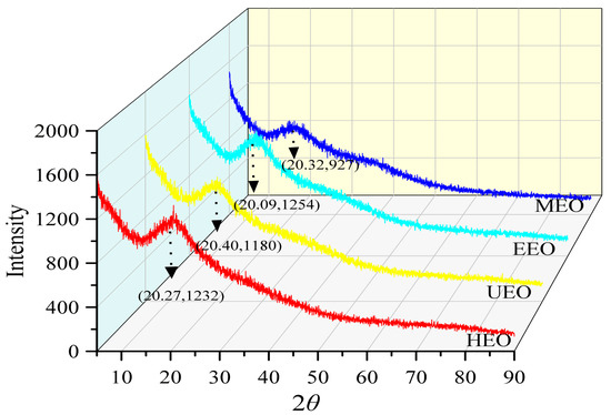 To determine the physical properties of the EO samples, XRD analysis was performed (Figure 5). The peak shape trends of 2θ were similar in the range of 5° to 90°, and both weak and broad diffraction peaks appeared at around 20°, which showed low crystallinity [37]. These findings indicated that the interiors of the four oligosaccharides have an amorphous structure. Based on Bragg’s equation for crystal diffraction (2d sin θ = nλ), the lattice spacing of HEO, UEO, EEO and MEO were 4.39 nm, 4.35 nm, 4.42 nm, and 4.37 nm at n = 1 and λ = 1.54 Å. The results showed that EOs obtained by hot-water, ultrasound-assisted, enzyme-assisted, and microwave-assisted methods had similar effects on the internal crystallinity, which led to similar powder states of the four oligosaccharide samples. While the 2θ of the diffraction peak of MEO was similar to that of other samples, the peak intensity was significantly lower, indicating that microwave-assisted extraction is more likely to affect the properties of the crystals.