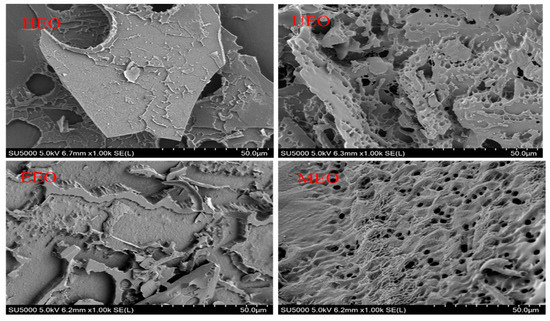 SEM is an important technique to characterize the microscopic morphological characteristics of polymer materials. To investigate whether different extraction methods could affect the morphology of the resulted EOs, SEM images of the four EO samples were obtained (Figure 6). The results showed that HEO formed a flake-shaped with cracks and holes on the surface. UEO presented a porous sheet shape with smaller holes on the surface compared to HEO. EEO had a flat sheet shape without holes. MEO has a porous and wavy surface. In contrast to EEO, the surface of UEO and MEO has many pores, which may be due to ultrasonic cavitation or microwave radiation acting on glycosidic bonds, respectively. Under the assistance of ultrasounds, enzymes, or microwaves, the intermolecular hydrogen bonds in HEO may be broken, resulting in decreased chain conformational stability and intermolecular cross-linking [38]. This may lead to a decrease of surface flatness and hole diameter.