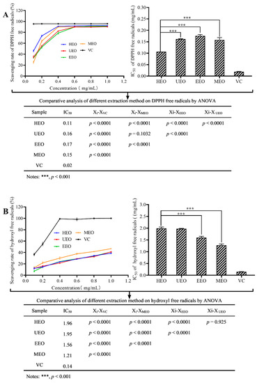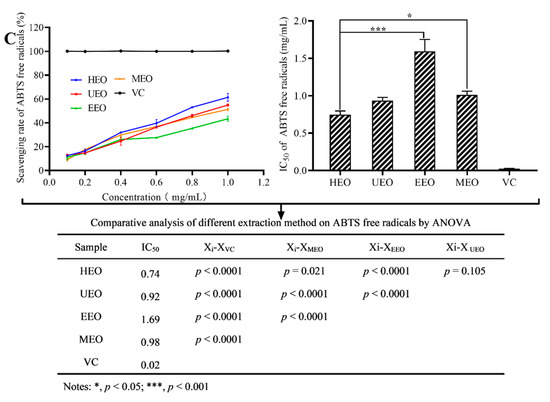 Free radical scavenging activities of EOs, (A) is DPPH free radicals, (B) is hydroxyl free radicals, (C) is ABTS free radicals.