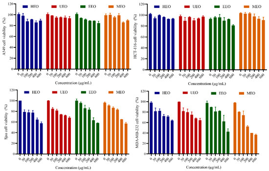 The relationship between antioxidant activity and antitumor activity of EOs under different methods was analyzed. The different concentrations (0–600 μg/mL) of EOs were used to treat A549, HCT-116, Sjsa-1, and MDA-MB-231 tumor cells. After 24 h incubation, cell proliferation inhibitory activity was analyzed by CCK-8. The results showed that EOs could inhibit Sjsa-1 and MDA-MB-231 cell growth in a dose-dependent manner, but had no obvious effects on the viability of A549 and HCT-116 cells (Figure 8). It appears that MDA-MB-231 cells are more sensitive to EOs compared to Sjsa-1 cells. The survival rates of MDA-MB-231 cells treated with 600 μg/mL of HEO, UEO, EEO and MEO were 63.78%, 64.34%, 42.59% and 36.53%, respectively. Additionally, the inhibitory effect of MEO was significantly higher than that of HEO. Interestingly, MEO was more active than the other EOs in the hydroxyl radical scavenging assay, but HEO showed the strongest antioxidant activity in the DPPH and ABTS radical scavenging assays, which indicates that the antitumor activity of EOs is not only related to their antioxidant capacity, but may also be related to their surface structure under different methods. Compared with HEO, the porous structure of MEO could increase its specific surface area, leading to increasing the probability of contact with tumor cell surface sites, which may enhance the tumor cell inhibitory effect of EOs. Since the effect of MEO on MDA-MB-231 cells was more prominent than other samples, MEO and MDA-MB-231 cells were selected for further studies.