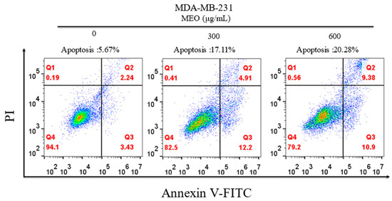 To further investigate the effect of MEO on cell growth, MDA-MB-231 tumor cells were incubated with different concentrations of MEO for 24 h, and stained with Annexin V-FITC/PI for flow cytometry analysis. The results showed that the proportions of apoptotic cells in cultures incubated with 300 and 600 μg/mL of MEO were 17.11% and 20.28%, respectively (Figure 9). Interestingly, the number of early-stage apoptotic cells in samples treated with 600 μg/mL of MEO was lower than those treated with 300 μg/mL of MEO. However, the trend reversed for late-stage apoptotic cells. The above results suggest that MEO can cause cancer cell death by inducing apoptosis.