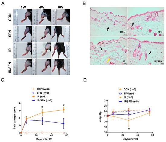 Mouse skin damage scores of the IR/SFN group were lower than the IR group at 4 w and 8 w after irradiation (p < 0.05) (Figure 1C). Compared with the control group, the body weight of mice in the IR group and IR/SFN group was decreased at 4 w and recovered to normal at 8 w. Meanwhile, the body weight of IR/SFN group mice was significantly higher than IR group mice (p < 0.05) (Figure 1D).