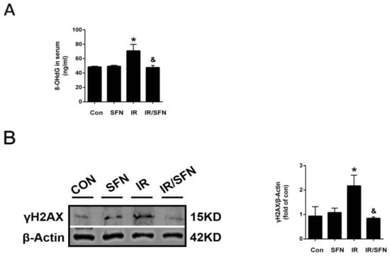 SFN prevents DNA damage caused by radiation. (A): The expression of 8-OHdG in skin blood serum was examined by ELISA. (B): The expression of γ-H2AX in skin tissues was examined by Western blotting. Data were expressed as the mean ± S.D. (n = 3 at least in each group) (* p < 0.05 vs. CON; & p < 0.05 vs. IR).