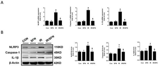 Prevention and treatment of SFN on radiation-induced skin inflammation. (A): The expressions of inflammatory factors, including NLRP3, caspase-1, and IL-1β mRNAs, were examined by real-time PCR. (B): The protein expressions of inflammatory factors, including NLRP3, caspase-1, and IL-1β, in skin tissues were examined by Western blotting. Data were expressed as the mean ± S.D. (n = 3 at least in each group) (* p < 0.05 vs. CON; & p < 0.05 vs. IR).