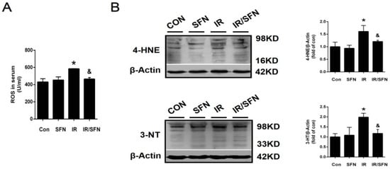 Prevention and treatment of SFN on radiation-induced skin oxidative stress. (A): The expression of ROS in serum was examined by ELISA. (B): The expressions of 3-NT and 4-HNE were measured by Western blotting due to the oxidative damage in the skin tissues. Data were expressed as the mean ± S.D. (n = 3 at least in each group) (* p < 0.05 vs. CON; & p < 0.05 vs. IR).