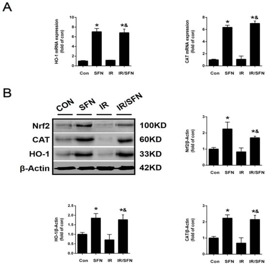 Activation of Nrf2 and expressions of its downstream genes in the skin induced by SFN. (A): The Nrf2 transcription function was examined by the expression of its downstream antioxidant gene (CAT, HO-1) mRNAs by real-time PCR. (B): The expression of Nrf2 in mouse skin tissues was detected by Western blotting. Nrf2 transcription function was examined by the expressions of its downstream antioxidant (CAT, HO-1) proteins with Western blotting. Data were expressed as the mean ± S.D. (n = 3 at least in each group) (* p < 0.05 vs. CON; & p < 0.05 vs. IR).