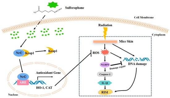In conclusion, our study demonstrated that SFN can upregulate antioxidant enzymes, including HO-1 and CAT, through the activation of Nrf2 and inhibit the NLRP3 inflammasome by suppressing the ROS production, alleviating RISI in mice. In addition, inhibition of NLRP3 inflammasome may have a positive effect on DNA damage, thereby promoting the repair of RISI (Figure 6). Therefore, the broccoli extract SFN has a positive modulatory effect on RISI by inhibiting Nrf2-mediated oxidative stress, as well as NLRP3 inflammasome. In the future, oral administration of natural broccoli extract sulforaphane (SFN) may be a new strategy for the prevention of RISI in cancer patients.
