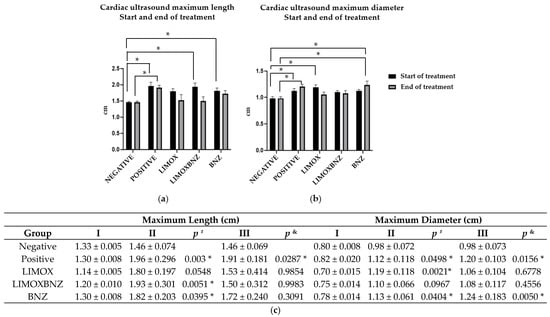 Echocardiography of Wistar rats infected with Trypanosoma cruzi. (a) Cardiac ultrasound maximum length start and end of treatment; (b) Cardiac ultrasound maximum diameter start and end of treatment; (c) Cardiac silhouette measurements via ultrasound (maximum length or ML and maximum diameter or MD) at the first (I), second (II), and third (III) echocardiography: (I) one day prior to infection; (II) at the start date of the therapies; and (III) at the end date of the treatments; p # compared with negative control measure from ultrasound II; p & compared with negative control measure from ultrasound III; * statistically significant difference at p < 0.05; Negative: untreated and uninfected animals; Positive: untreated and infected animals; LIMOX: infected animals treated with a mixture of an essential oil fraction of L. alba carvone chemotype enriched in limonene (68.9 mg/kg/day) and with added caryophyllene oxide (Sigma-Aldrich) (70 mg/kg/day); LIMOXBNZ: infected animals treated with LIMOX plus benznidazole (7.9 mg/kg/day); BNZ: infected animals treated with benznidazole (100 mg/kg/day). Data are representative of six independent experiments and values are expressed in mean ± SEM.