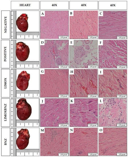 Macro and microscopic findings in the hearts of Wistar rats infected with Trypanosoma cruzi. Histological images taken using a 40× objective on Hematoxylin and Eosin stained tissue sections. Negative: untreated, uninfected animals; Positive: untreated, infected animals; LIMOX: infected animals treated with an essential oil fraction of Lippia alba carvone chemotype enriched in limonene (68.9 mg/kg/day) and with added caryophyllene oxide (Sigma-Aldrich) (70 mg/kg/day); LIMOXBNZ: infected animals treated with LIMOX and benznidazole (7.9 mg/kg/day); BNZ: infected animals treated with benznidazole (100 mg/kg/day). (A–C): Normal heart tissue. (D). Large focal inflammatory infiltrate in myocardium with lymphocytes, histiocytes, and plasma cells. (E). Aggregate of cardiac plexus neurons, surrounded by lymphocytic infiltrate. (F). Multifocal infiltrate with minimal angiogenesis and loose, elongated, and sinusoidal fibers with fibrotic process. (G). Small histiocytic inflammatory infiltrate. (H). Apparent reparative process. (I). Lymphocytic inflammatory infiltrate with minimal fibrosis. (J). Loose and elongated fibers, with histiocytic lymphocyte inflammatory infiltrate. (K). Mild lymphohistiocytic infiltrate. (L). Diffuse linear inflammatory infiltrate, with minimal fibrosis. (M) Focal of inflammatory infiltrate in plasma lymphocytoid, loose and elongated fibers. (N). Foci of lymphocytic inflammatory infiltrate; loose, elongated fibers. (O). Focal of inflammatory infiltrate of lymphocytes and plasma cells; dilated, loose, and elongated fibers with a sinuous appearance; with fibrosis. Figures are representative of six independent experiments.
