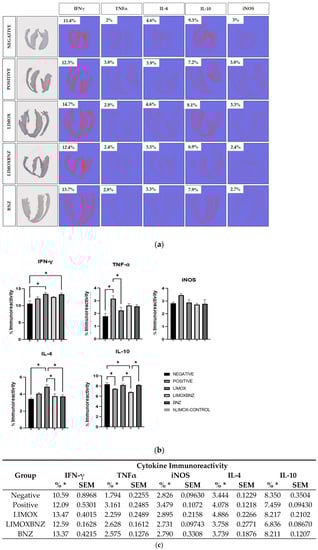 Immunohistochemical analysis of cardiac tissue (a) Percentages of immunoreactivity obtained on cross sectional cuts of heart tissue by specific antibodies for Interferon gamma (IFN-γ), Tumor Necrosis Factor alpha (TNF-α), Interleukin (IL)-4, IL-10, and inducible Nitric Oxide Synthase (iNOS); (b,c) Comparison of immunoreactivity percentages within groups. Negative: untreated and uninfected animals; Positive: untreated and infected animals; LIMOX: infected animals treated with an essential oil fraction of L. alba carvone chemotype enriched in limonene (68.9 mg/kg/day) with added caryophyllene oxide (Sigma-Aldrich) (70 mg/kg/day); LIMOXBNZ: infected animals treated with LIMOX and benznidazole (7.9 mg/kg/day); BNZ: infected animals treated with benznidazole (100 mg/kg/day). All p values were calculated by comparison within groups. * p ≤ 0.05. Data are representative of six independent experiments and values are expressed in mean ± SEM.