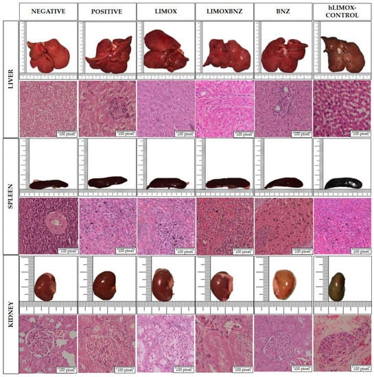 With reference to an effect on spleen architecture, differential responses were observed among therapies. Specifically, splenomegaly was present in the positive control animals and in those treated with both LIMOX and LIMOXBNZ, while BNZ caused a reduction in the size of this organ. This hyposplenism could be correlated with the deleterious effect on adequate balancing of the defense response, as observed herein, in animals treated with the reference therapy [].