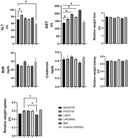 Additionally, splenomegaly was evident in 16.6% of the animals in the LIMOXBNZ-treated experimental group and in 50% of the animals belonging to the LIMOX-treated and positive control groups (Figure 4). In contrast, a significant reduction in the relative weight of this organ was evident in animals subjected to BNZ treatment (Figure 4 and Table 5). In addition, therapies which included that same compound (i.e., BNZ or LIMOXBNZ) induced the presence of hemosiderophages in the spleens of some of the treated animals (16.6%) (Figure 3). In a similar manner, kidney toxicity was apparent in 16.6% of the rats treated with BNZ, presenting as a pale brown color in the macroscopic analysis (Figure 3), but without altering the histopathological or biochemical parameters in the organ. With respect to BUN, a statistically significant elevation in this marker was observed in the LIMOX group compared to the reference treatment (BNZ) (p = 0.0048), but with no difference in creatinine values (Figure 5).