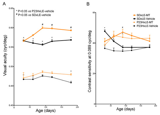 Visual acuity (VA) (A) and contrast sensitivity (CS) (B) values obtained in different treatment groups in P23HxLE and SDxLE rats: P23HxLE-vehicle, P23HxLE-MT, SDxLE-vehicle, and SDxLE-MT. Data obtained at P30, 60, 90, 120, and 180 by optometry on average between the anti- and clockwise directions. Data plots show the mean ± SEM (n = 5/group). Mann–Whitney U test: # p < 0.05 versus SDxLE animals, * p < 0.05 versus P23HxLE-vehicle animals. MT, melatonin.