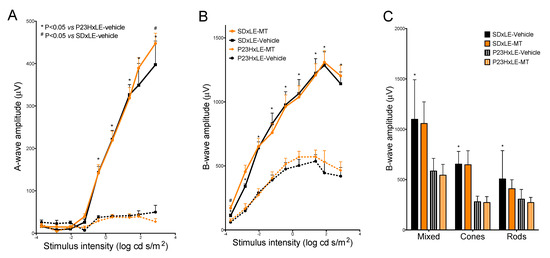 Electroretinogram recordings. Scotopic a- (A) and b-wave (B) responses for flashes of 0.0002, 0.0015, 0.0092, 0.06, 0.38, 2.38, 23.19, 78, and 722 cd.s/m2 intensities, and the double-flash protocol (C) recorded at P180 in the P23HxLE and SDxLE treatment groups: SDxLE-vehicle, SDxLE-MT, P23HxLE-MT, and P23HxLE-vehicle. Data plots show the mean ± SEM (n = 5). Mann–Whitney U test: # p < 0.05 versus SDxLE animals, * p < 0.05 versus P23HxLE-vehicle animals.