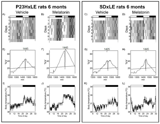 Significant differences were found between SDxLE and transgenic P23HxLE rats, highlighting the temperature–L2 parameter (the least temperature 2 h), reaching almost a displacement of 9 h when comparing P23HxLE (13:55 ± 1:24 h) to SDxLE rats (5:05 ± 2:30 h). This parameter is also significantly different in locomotor activity rhythm (P23HxLE rats: 6:45 ± 0:20 h, and SDxLE rats: 6:31 ± 0:24 h). Higher values of activity were observed in wild-type animals (4.47 ± 0.42 vs. 2.69 ± 0.28 in P23HxLE rats). The index that correlates the temperature–L2 parameter with the activity–L2 parameter is the desynchronization index L2. The synchronization between core body temperature and locomotor activity was worse in P23HxLE rats (0.60 ± 0.11) than in wild-type rats (0.19 ± 0.14). A score of 0 indicates perfect synchronization between the parameters. Treatment with melatonin decreased the desynchronization index L2 in both P23HxLE (0.26 ± 0.07) and SDxLE rats (0.09 ± 0.04), indicating a better circadian pattern in these animals than in those without treatment.