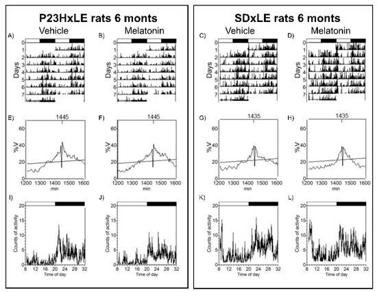 The retina is involved not only in vision but also in other non-visual functions, such as the regulation of circadian rhythms. Light is detected by a subset of retinal ganglion cells characterized by a special opsin, melanopsin. These cells send ambient light information to a specific region of the central nervous system, the suprachiasmatic nucleus, which is the main circadian pacemaker. This nucleus is responsible for regulating the 24 h day/night cycle and other functions, such as the secretion of melatonin from the pineal gland. In the absence of light in the retina, the circadian system loses this synchronization with the environment and acquires its own rhythm, making it difficult to differentiate the 24 h environmental day/night cycle [49]. This is a common feature in blind people, especially those who have lost light perception. This abnormal 24 h period causes sleep disturbances and free-running circadian rhythms, which affect parameters such as core body temperature, activity, and melatonin concentration, among others [50,51]. In the present study, P23HxLE rats showed a delayed entrainment rhythm based on the analysis of the L2 parameter in temperature, with a displacement of almost 9 h in these animals, and the desynchronization index L2, with a difference of 7 h between the lowest 2 h of temperature and activity. There was no significant difference, however, in non-parametric variables such as relative amplitude, intradaily variability, and interdaily stability. These findings are supported by the results of another study [51] that demonstrated that the retinal melanopsin system is impaired and circadian rhythms are disturbed in late-stage RP. Melatonin administration to wild-type animals significantly reduced the desynchronization index L2, similar to in P23HxLE rats, demonstrating the ability of this molecule to synchronize 24 h endogenous rhythms, as in physiological conditions [52]. Lax et al. [26] supplied melatonin to P23H-3 rats at a concentration of 2 mg/kg/day for 16 months, and showed reduced retinal degeneration as well as reduced circadian rhythmicity impairment, supporting our results.