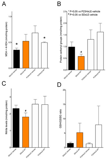 Hepatic levels of lipid peroxidation (A), oxidized proteins (B), nitrosative damage (C), and the GSH/GSSG ratio (D) in wild-type (SDxLE) rats and P23HxLE rats without treatment (vehicle) and those treated with melatonin (MT). Data represent the mean ± SEM (n = 5). Mann–Whitney U test: # p < 0.05 versus SDxLE animals, * p < 0.05 versus P23HxLE-vehicle animals.