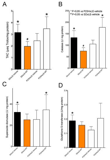 The measurement of total antioxidant capacity (Figure 6A) showed lower values in P23HxLE rats compared with wild-type rats. Melatonin treatment increased by 42% in this parameter, but in SDxLE-MT rats the total antioxidant capacity was decreased by 37.5%. Levels of the three antioxidant enzymes (CAT, SOD, and GST) were lower in P23HxLE rats than in SDxLE rats: a reduction of 21.1% in CAT, 21.2% in SOD, and 34.4% in GST. Both CAT (Figure 6B) and SOD (Figure 6C) showed increased activity levels with melatonin treatment in P23HxLE, with CAT increasing by almost 41% and SOD increasing by 26.3%, but not GST, which did not differ significantly from the sham group.