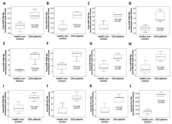 Twelve up-regulated microRNAs identified by next-generation sequencing in the comparison between OSA patients and healthy non-snorers in the discovery cohort. Normalized read counts of the (A) miR-10a-5p, (B) miR-16-1-5p, (C) miR-18a-5p, (D) miR-106a-5p, (E) miR-146b-5p, (F) miR-148b-3p, (G) miR-223-5p, (H) miR-335-5p, (I) miR-374b-5p, (J) miR-421-3p, (K) miR-let-7a-1-3p, and (L) miR-let-7a-1-5p genes were increased in OSA patients versus healthy non-snorers.