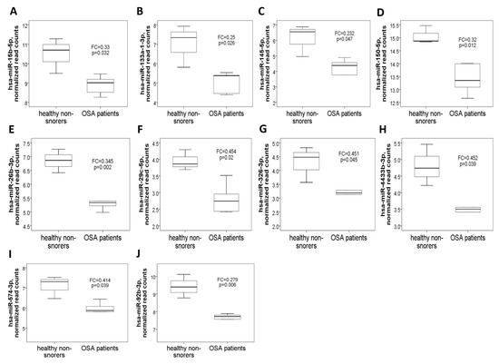 Ten down-regulated microRNAs identified by next-generation sequencing in the comparison between OSA patients and healthy non-snorers in the discovery cohort. Normalized read counts of the (A) miR-15b-5p, (B) miR-133a-1-3p, (C) miR-145-5p, (D) miR-150-5p, (E) miR-26b-3p, (F) miR-29c-5p, (G) miR-326-3p, (H) miR-4433b-3p, (I) miR-574-3p, and (J) miR-92b-3p genes were decreased in OSA patients versus healthy non-snorers.
