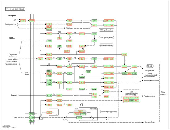 Gene pathway representation of interactions between gene target predictions of the 22 differentially expressed microRNAs. The most significant KEGG pathway of cellular senescence is identified by over-representation analysis with the gene list derived from the validated target genes of the 22 miRNAs (see Section 2). The FDR-adjusted p-value of the pathway is 1.2 × 10−13. Predicted target genes are shown in red letters and boxes with red lines.