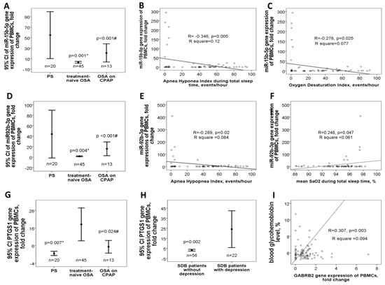 Down-regulated miR-15b-5p/miR-92b-3p genes and corresponding changes of their predicted target genes in the validation cohort. MiR-15b-5p gene expression was (A) decreased in treatment-naïve OSA patients versus either PS subjects or OSA patients on long-term CPAP treatment, and negatively correlated with (B) apnea hypopnea index (AHI) and (C) oxygen desaturation index. miR-92b-3p gene expression was (D) decreased in treatment-naïve OSA patients versus either PS subjects or OSA patients on long-term CPAP treatment, (E) negatively correlated with AHI, and (F) positively correlated with mean oxygen saturation (SaO2) during total sleep time. PTGS1 gene expression was (G) increased in treatment-naïve OSA patients, and (H) further increased in those with depression. (I) ADRB1 gene expression was negatively correlated with nadir SaO2.