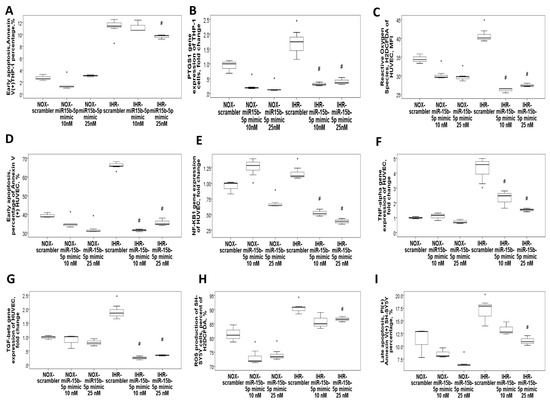 IHR treatment in vitro resulted in down-regulation of both the miR-92b-3p and miR-15b-5p genes, while miR-15b/5p and miR-92b-3p transfection resulted in efficient over-expression of both miRs (Supplementary Figure S4). Transfection with miR-15b-5p mimic at 25 nM in THP-1 cells reversed IHR-induced early apoptosis (percentage of Annexin V(+) PI (−) cells, Figure 6A), and IHR-induced up-regulation of its predicted target genes, including PTGS1 (Figure 6B), GABRB2, ADRB1, LEP, GARG1, TNFSF13B, and VEGFA (Supplementary Figure S5). Transfection with a miR-15b-5p mimic in HUVEC reversed IHR-induced ROS production (H2DCFDA incorporation, MFI, Figure 6C), IHR-induced early apoptosis (percentage of Annexin V(+) PI (−) cells, Figure 6D), and IHR-induced up-regulation of the NF-κB1, TNF-α, and TGF-β genes (Figure 6E–G). Transfection with a miR-15b-5p mimic in SH-SY5Y cells reversed IHR-induced ROS production (percentage of H2DCFDA, Figure 6H), late apoptosis (percentage of PI(+) Annexin V(+) cells, Figure 6I).