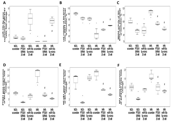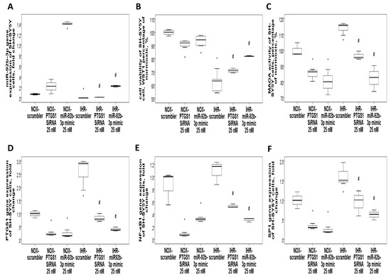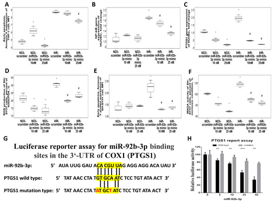 Transfection with miR-92b-3p mimic at 25 nM in THP-1 cells reversed IHR-induced early apoptosis (Annexin V protein expression, MFI, Figure 7A) and up-regulations of the CXCL5 and ADRB1 genes (Supplementary Figure S6. Transfection with a miR-92b-3p mimic in HUVEC reversed IHR-induced up-regulation of the NF-κB1 (Figure 7B), PTGS1 (Figure 7C), TNF-α, and TGF-β (Supplementary Figure S6) genes. Transfection with a miR-92b-3p mimic in SH-SY5Y cells reversed IHR-induced ROS production (percentage of H2DCFDA, Figure 7D), early apoptosis (Annexin V expression, MFI, Figure 7E), and MAOA hyperactivity (percentage of normoxic condition, Figure 7F), while MAOB activity was not altered.