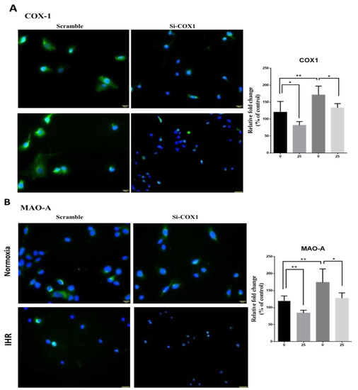 PTGS1 (COX1) knock-down reversed intermittent hypoxia with re-oxygenation (IHR)-induced up-regulation of MAOA hyperactivity. Representative micrographs of immunofluorescence staining in SH-SY5Y neuron cells with or without the knock-down of PTGS1 under IHR versus normoxic (NOX) conditions are given for (A) COX1, and (B) MAOA. IHR resulted in over-expressions of COX1, and MAOA hyperactivity, both of which were reversed with the knock-down of COX1. DAPI (blue) is used for staining the nuclei. Localizations of the two molecules are indicated in green. All the micrographs are a merge of the two stainings. Quantified values are stratified based on the response to IHR stimuli and PTGS1 SiRNA transfection. Kruskal–Wallis test with post-hoc analysis was used for comparisons between four groups. * p < 0.05. ** p < 0.01.