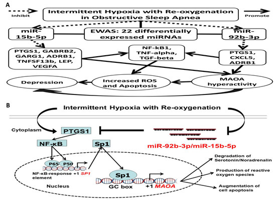 The proposed interplay between miR-15b-5p/miR-92b-3p and their target genes in the intermittent hypoxia with re-oxygenation (IHR) model of obstructive sleep apnea (OSA). (A) These interactions contribute to the development of depression by IHR-induced MAOA hyperactivity and IHR-induced oxidative stress/apoptosis/inflammation in OSA patients. (B) A schematic diaphragm depicts the protective effect of miR-15b-5p/miR-92b-3p mimics on IHR-induced oxidative stress and cell apoptosis through inhibiting MAOA via targeting PTGS1-NF-κB-SP1 signaling in OSA-related depression. IHR augments PTGS1, which increases the NF-κB expression that in turn activates MAOA gene transcription through augmenting the binding of SP1 to the promoter region of the MAOA gene. Down-regulation of miR-15b-5p/miR92b-3p in response to chronic IHR in OSA leads to MAOA hyperactivity, oxidative stress, and cell injury through targeting PTGS1-NF-κB1-SP1 signaling. MAOA = monoamine oxidase A; PTGS1 = prostaglandin-endoperoxide synthase 1; NF-κB1 = nuclear factor kappa B subunit 1; SP1 = Sp1 transcription factor.