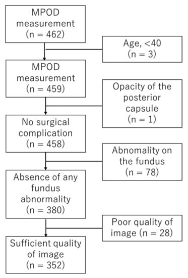 After measuring MPOD in 462 eyes between 3 and 5 days after cataract surgery, patients aged less than 40 years were excluded. Then, 352 eyes of 242 patients were enrolled in this study. Figure 1 shows the subject selection process. Patients were 41–91 years old, with a mean age of 72.3 ± 8.6 (standard deviation, SD) years. The median was 74 years. Men were 108 (155 eyes), and women were 134 (197 eyes). Some eyes were described in our previous manuscripts and were analyzed in different ways [,,,,,].