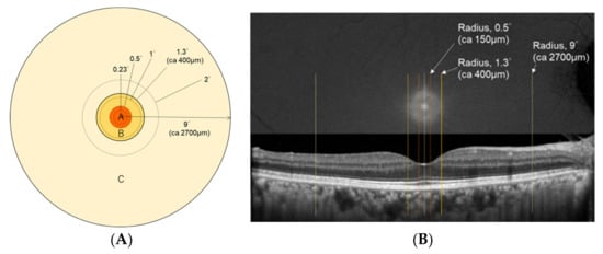 The area within 9° eccentricity was divided into three zones (Figure 2A). Zone A was the area within a radius of 0.5° that corresponded to the anatomical foveola, zone B was a ring delimited by radii of 0.5° and 1.3° that corresponded to the inner half of the anatomical fovea, and zone C was a ring delimited by radii of 1.3° and 9° that corresponded to the anatomical macula. According to Li et al. [], zone A contains mostly Z, zone B contains both Z and L, and zone C contains mostly L. Therefore, MPOD(0.23), MPOD(0.5), and MPOV(0.5) contain mostly Z, MPOD(2) and MPOV(1.3–9) contain mostly L, while MPOD(1) and MPOD(1.3) contain a mixture of Z and L. Each location was projected on the MP and OCT images for identifying the exact sites (Figure 2B).