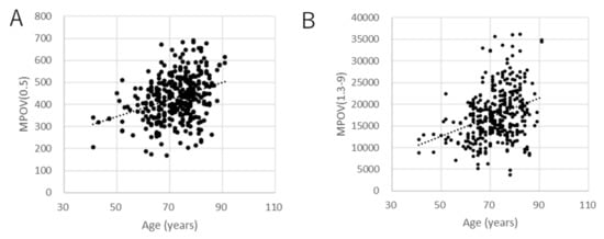 Scatter plots of MPOV against age. (A) MPOV(0.5) (coefficient = 3.47, p < 0.001, linear mixed model), (B) MPOV(1.3–9) (coefficient = 209.3, p < 0.001, mixed linear model).