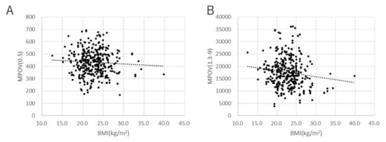 Scatter plots of MPOV against BMI. (A) MPOV(0.5) (coefficient = −2.17, p = 0.30). (B) MPOV(1.3–9) (coefficient = −311.8.0, p = 0.010, mixed linear model).