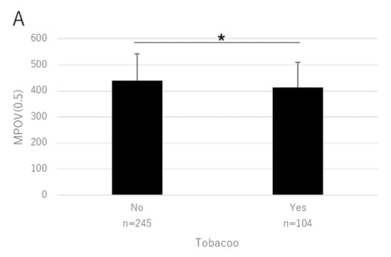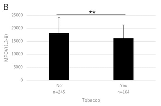 Mean MPOV in patients in relation to their smoking history. (A) MPOV(0.5) (* p = 0.0040). (B) MPOV(1.3–9) (** p = 0.0010, mixed linear model). Bar represents standard deviation.