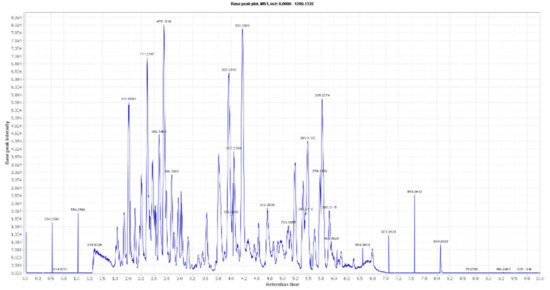 LC-HRESIMS chromatogram of the dereplicated metabolites of Olea europaea (Positive).