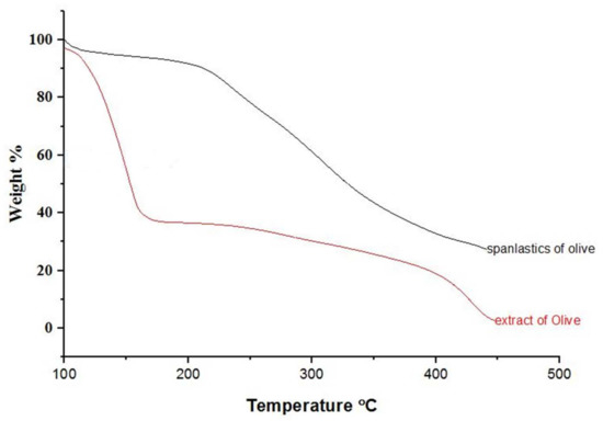 Physicochemical changes in compounds as a function of temperature were evaluated by TGA. TGA curves for OLE and OLE spanlastics are shown in Figure 5. During heating from 30 to 450 °C, about 62 and 13% weight loss was detected at a temperature of 126 °C for OLE and OLE spanlastics, respectively. Weight loss may be due to the phase transition caused by a change in the molecular structure. Results reveal the enhanced thermal balance of the entrapped cargo owing to spanlastic encapsulation.